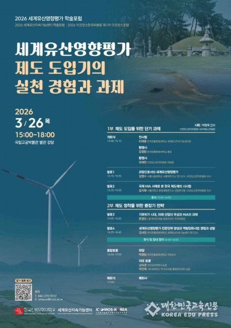 [대한민국교육신문] 국가유산청 한국전통문화대학교는 이코모스한국위원회와 함께 3월 26일 오후 3시 국립고궁박물관 별관 강당(서울 종로구)에서 '2026 세계유산영향평가 학술 토론회(포럼)'을 개최한다. 이번 포럼은 ‘세계유산영향평가(HIA, Heritage Impact Assessment) 제도 도입기의 실천 경험과 과제’를 주제로, 제도 도입 초기의 실천 경험을 공유하고 운영 과정에서 드러난 주요 쟁점을 점검하며, 향후 단기·중장기 개선 과제와 발전 방향을 모색하기 위해 마련됐다.
