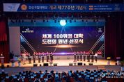 [대한민국교육신문] 경상국립대학교는 10월 20일 오전 10시 가좌캠퍼스 GNU컨벤션센터 2층 대강당에서 개교 77주년 기념식을 개최했다. 개교기념식은 개식, 국민의례, 대학 연혁 보고, 개척시 낭송, 총장 기념사, 축사, 시상식, 비전 선포식, 교가 제창, 기념 촬영 등의 순으로 진행했다. 개교기념식 행사는 경상국립대학교 유튜브 채널을 통해 실시간 송출했다. 경상국립대학교는 기념식에서 각종 시상식[개척명예장, 총장 특별상, 개척한림원 표창, 7인의 영리서처(Young Researcher) 현판 수여, 장기근속상]을 마련하여 대학 발전에 기여한 교내·외 인사와 우수 연구자들의 공로를 기렸다. ▲개척명예장은 ㈜영남소방엔지니어링 류상수 대표에게 수여했다. 류상수 대표는 경상국립대학교 농업기계공학과를 졸업(1982년)했으며, 삼성공조(주), 안전보건공단 등을 거쳐 1996년에 ㈜영남소방엔지니어링에 입사 후 2005년 대표이사로 취임했다. 3월 14일 대학발전기금 1억 원을 출연하며 “나눔을 받아야 하는 대상은 많지만 모교 후배들의 장학을 위한 발전기금으로 기부하는 것이 무엇보다도 가치 있는 일이고, 그들로 하여금 또 다른 사회봉사가 이루어질 수 있다고 생각되어 모